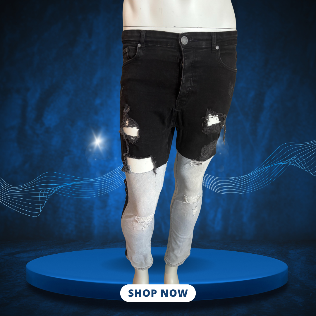 The Black REconstruction Jeans emerge as a one-of-one triumph of upcycled artistry, deconstructing and fusing two distinct denim lives into a dual-tone powerhouse that blends light-wash distressed upper panels with sleek black lower legs for dramatic color and texture contrast. Authentic wear marks on the faded top half meet raw hems, frayed openings, and hand-applied distressing on the deconstructed black base, achieved through precise cutting along seams and intentional reconstruction of reclaimed pieces. This process honors sustainable techniques like opening inner leg seams and repurposing rigid denim scraps, breathing new silhouettes into discarded fabric while minimizing waste.