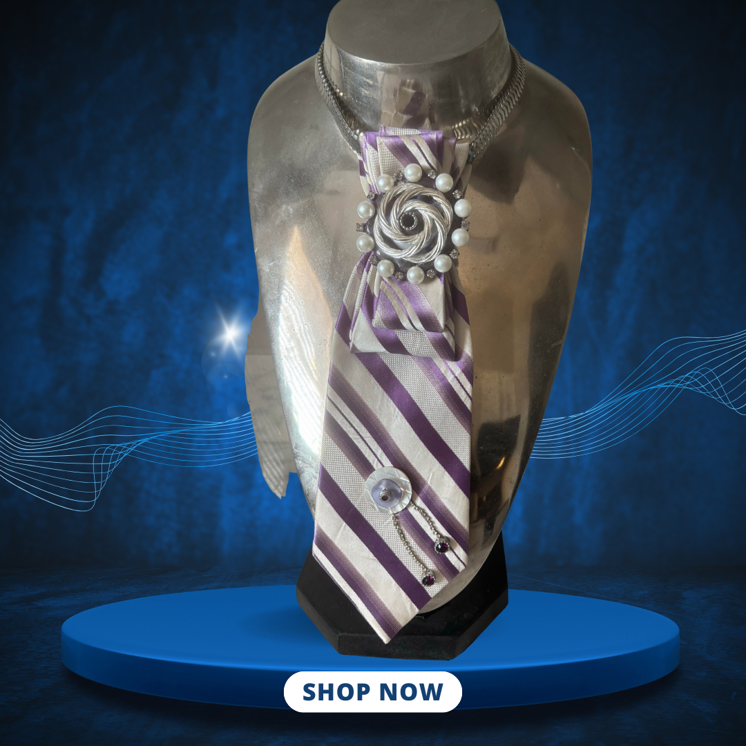 Unique tie necklace with purple and white stripes. Features a custom brooch, silver rose and pearl accents.