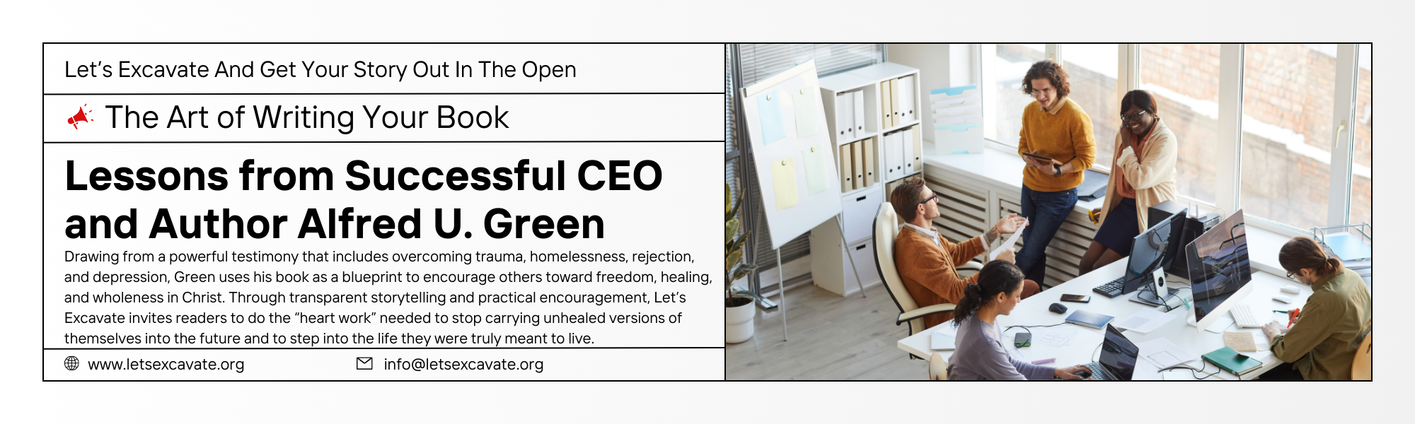 Alfred U. Green, author of Let’s Excavate, is a transformational storyteller who uses his own journey through trauma, homelessness, and healing to help others confront their past and step into purpose. Through his writing services, he walks aspiring authors from the initial vision of their book to a fully published work—helping them clarify their message, structure their story, and develop authentic, faith-centered content that speaks to the hearts of their readers.